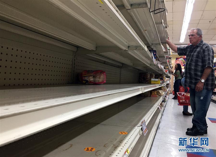 9月8日,在美国佛罗里达州迈阿密,一家超市部分货架上的商品被抢购一空。 随着在加勒比海上肆虐的飓风“艾尔玛”向美国南部靠近,佛罗里达州大量民众正加速撤离潜在受灾地区。当地许多居民到超市抢购食品和饮用水,一些加油站已无油可加。连日来,“艾尔玛”重创多个加勒比海东北部海岛,造成大量房屋被毁、至少14人丧生。 新华社记者殷博古摄