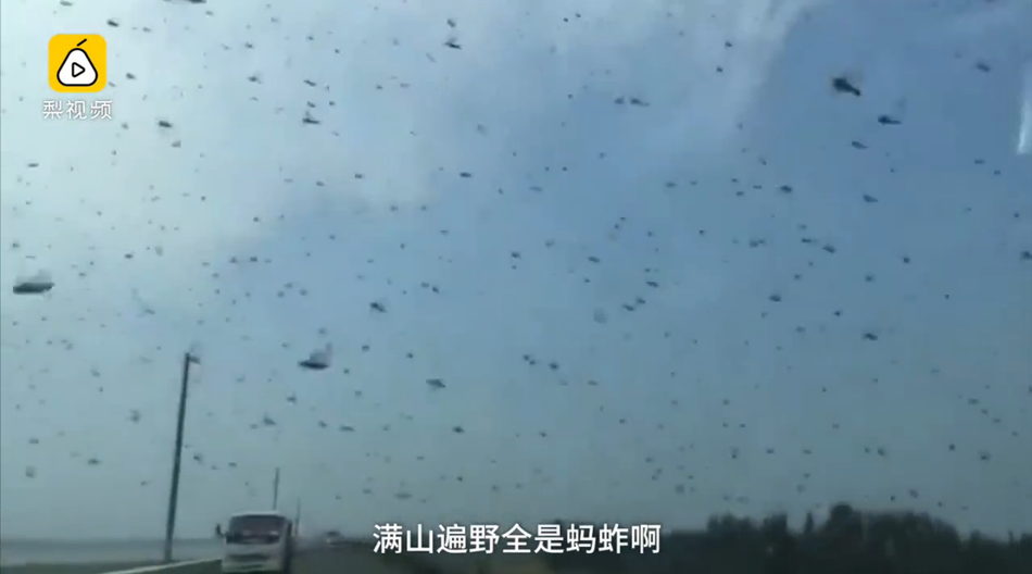 9月8日,山东安丘峡山水库四周出现大量蝗虫,水库周围的庄稼已经被蝗虫席卷。来源:梨视频