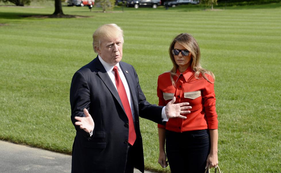 当地时间2017年9月10日,美国华盛顿,美国总统特朗普夫妇从戴维营过完周末返回白宫。美国总统特朗普就飓风"艾尔玛"登陆美国发表讲话,妻子梅拉尼娅陪同。