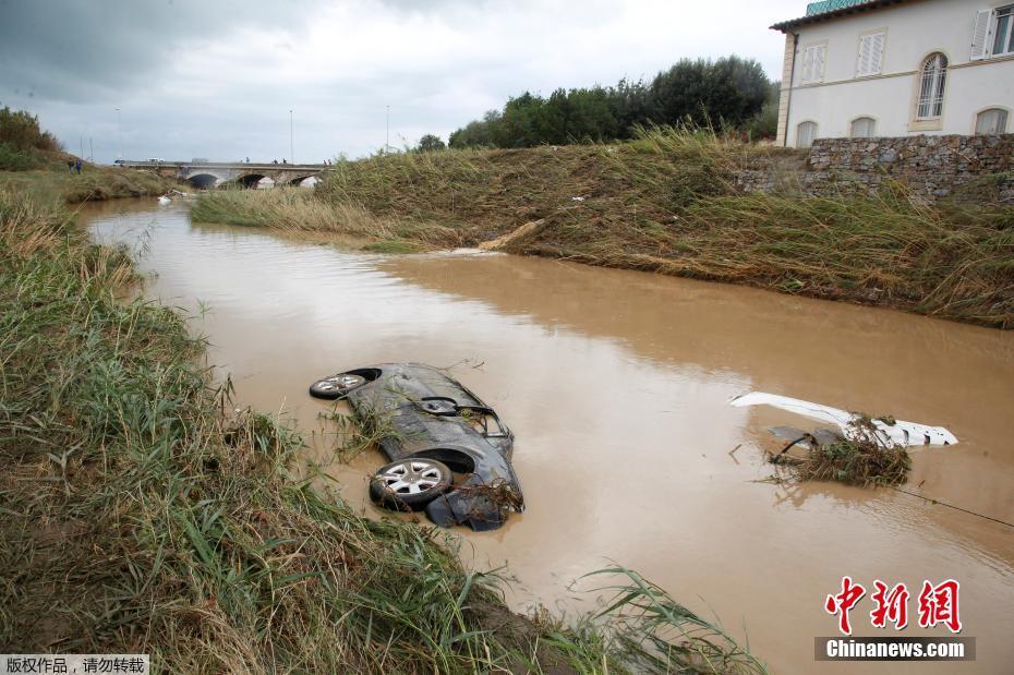 当地时间2017年9月10日,意大利里窝那遭暴雨袭击,引发山体滑坡、泥石流、洪涝,致6人死亡,数人失踪。图为被冲到河中的汽车。