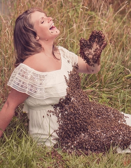 9月3日报道,美国俄亥俄州亚克朗市33岁的孕妇埃米莉?米勒(Emily Mueller)拍摄了一组与众不同的孕照,在网上引起热议。照片中,2万只活蜜蜂蜂拥在她隆起的腹部上。