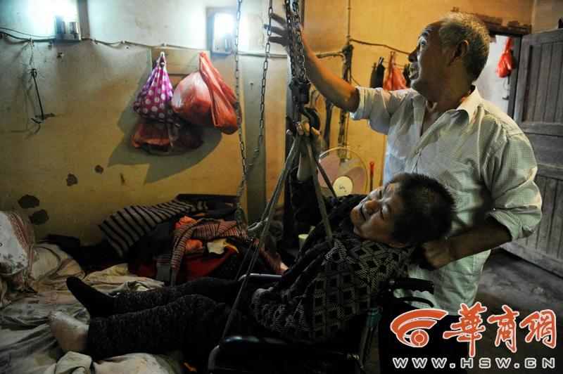 彭美成和老伴杨厚芝家住陕西柞水县什家湾村。妻子杨厚芝因脑溢血后遗症瘫痪在床,丈夫彭美成这一照顾就是7年。如今彭美成已是古稀之年,再也抱不起瘫痪的爱人,每天依靠安装在天花板的倒链照顾着妻子的生活起居。