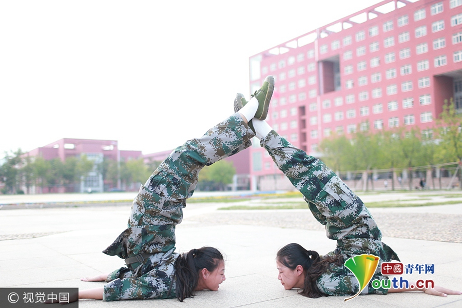 2017年9月22日,在山东日照,曲阜师范大学(日照校区)内新生进行军训,在休息间隙,舞蹈系的新生大秀一字马、胸倒立等绝技,显出舞蹈新生的深厚功底。