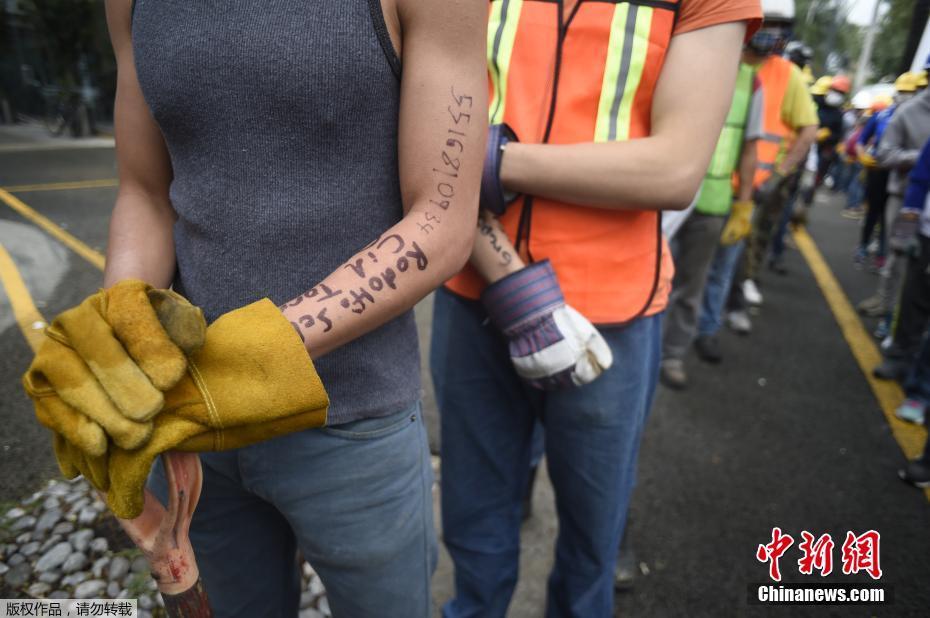 当地时间9月21日,墨西哥墨西哥城的地震救援人员手臂上书写自己的名字、血型、亲属电话等个人信息,以防不测。截至目前,19日中午发生在墨西哥中部的7.1级地震已造成至少273人遇难。图文:中国新闻网