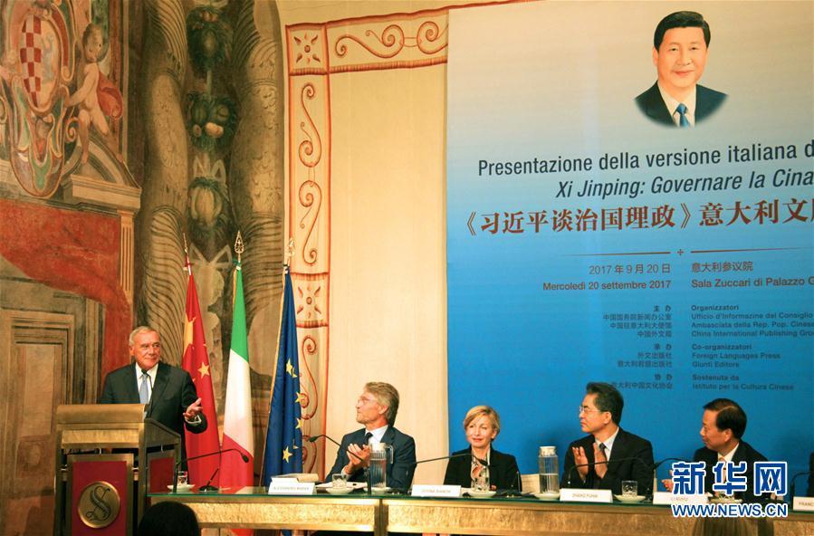 9月20日,在意大利罗马,意大利参议院议长格拉索(左一)在《习近平谈治国理政》意大利文版首发式上致辞。《习近平谈治国理政》意大利文版和阿尔巴尼亚文版首发式近日分别在意大利首都罗马和阿尔巴尼亚首都地拉那举行。 新华社记者李洁摄