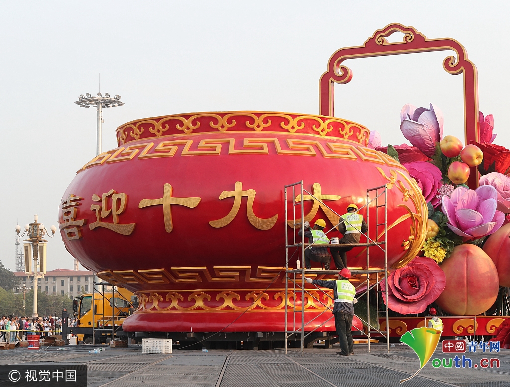 2017年9月23日,迎国庆天安门广场大花篮“喜迎十九大”字样亮相。当天北京园林工人正在加紧吊装大花篮。