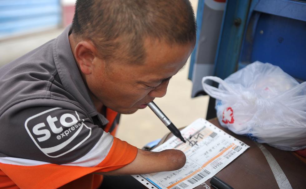 2017年9月25日,山西运城,今年34岁的赵海峰是一名快递小哥,因其没有双臂,仅靠双脚和一辆电动三轮车,就和正常人一样在城市里天天穿梭收送快递,以顽强的毅力和不向命运低头的倔强劲儿挣钱养活一家三口,赢得了周边人的认可,被赞“无臂硬汉”。