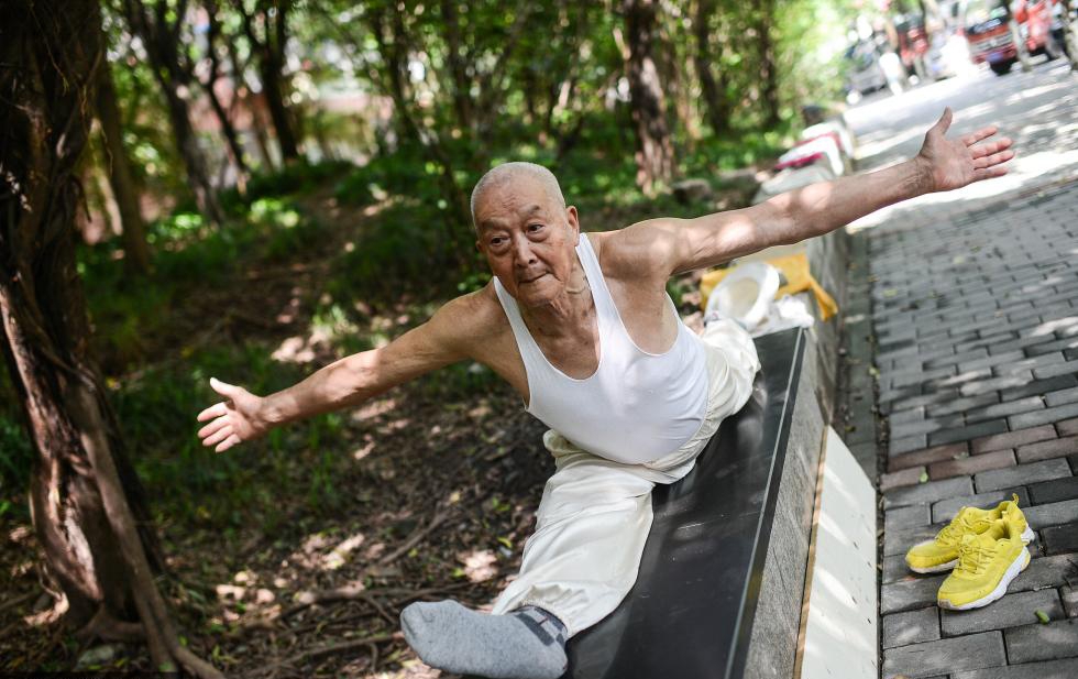2017年9月11日,重庆。一口气做108下俯卧撑,一抬脚就能完成竖劈叉,一只手转动20斤重的健身球……这些都是一位90岁大爷的健身“绝活”,你相信吗?这位大爷名叫周汝华,今年刚好90岁,因为热爱健身,已成小区周围的红人。