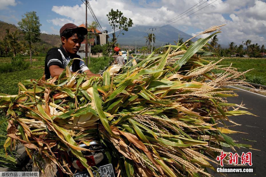 当地时间2017年9月26日,印尼巴厘岛,当地民众在阿贡火山附近收割成熟的庄稼。