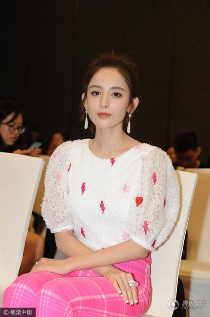 视觉中国讯 2017年9月26日,上海,电影《缝纫机乐队》发布会,古力娜扎现身活动现场。娜扎身着粉色格子裤、白色泡泡袖衬衫优雅靓丽不失甜美,与乔杉贴耳热聊说悄悄话显亲密,不惧男友张翰吃醋。