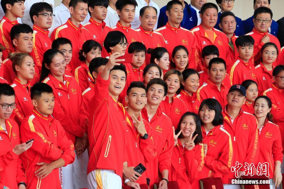 9月26日,孙杨等全运会浙江代表团成员自拍合影。当日,第十三届全运会浙江体育代表团总结表彰大会在浙江杭州举行。