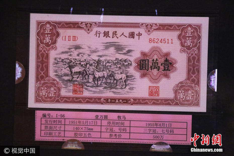 9月23日,钱币收藏爱好者在山东滨州一场珍邮钱币收藏鉴赏会上观赏展出的珍贵藏品。在鉴赏会上,很多难得一见的珍贵邮票和钱币集中亮相,其中标价500万的1951年壹万圆牧马图、160万的壹万圆骆驼队、120万的伍佰圆瞻德城、100万的伍仟圆蒙古包、9.6万的背绿水印壹角等天价钱币受到很多关注。 图片来源:视觉中国