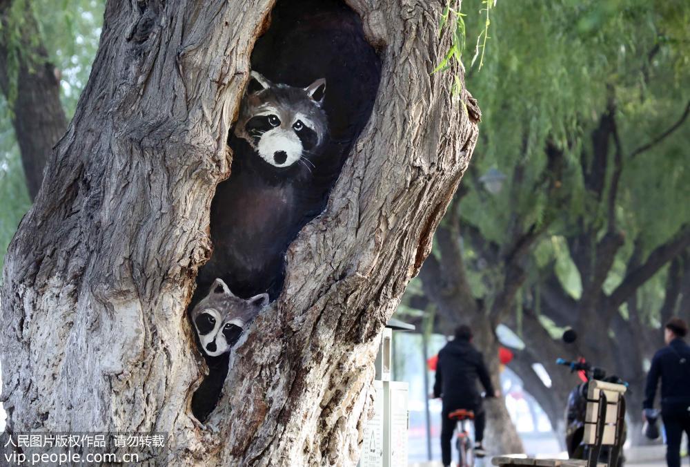 沈阳:惟妙惟肖“树洞画”吸引路人