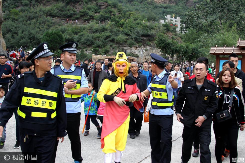 “大圣”被游客围住难脱身 搬“救兵