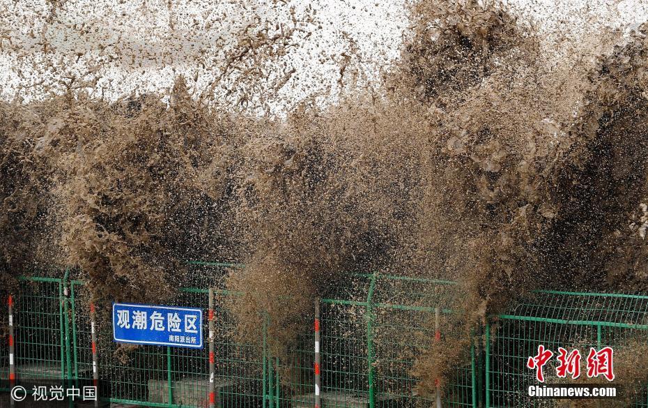 2017年10月6日,杭州,农历八月十七钱塘江大潮日,在杭州萧山美女坝观潮点,汹涌的“回头潮”冲上堤岸,掀起2米多高的巨浪,让各地的观潮游客大呼过瘾。
