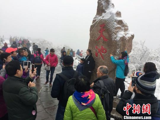 10月6日,一场强降雪后,秋日绚丽的新疆天山天池景区呈现给游客冬日的模样,湖畔的植被被白雪覆盖,当地气温逐渐走低。但雪天难挡游人的脚步,大批游客来到景区游览赏雪景。游客在天池边合影。甄梅摄