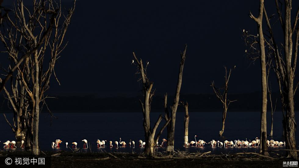 2017年10月6日讯(具体拍摄时间不详),肯尼亚柏哥利亚湖,数千只火烈鸟在湖上聚集觅食。