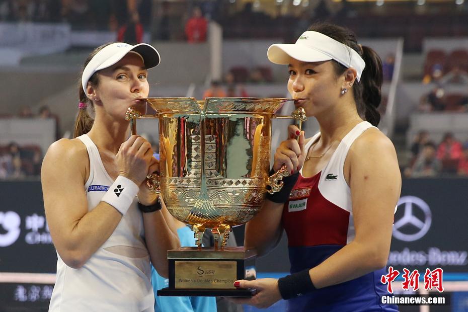 10月8日,詹咏然与辛吉斯(左)庆祝夺冠。 当日,在北京举行的2017中国网球公开赛女子双打决赛中,詹咏然/辛吉斯组合2比0战胜巴博斯/赫拉瓦科娃组合,夺得冠军。 中新社记者 韩海丹 摄