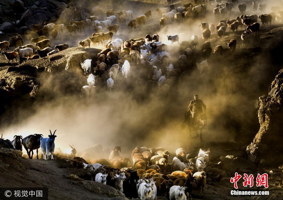 9月中旬,新疆阿勒泰,随着春牧场气温的下降,哈萨克牧民赶着牲畜向冬牧场转移。杨发维 摄 图片来源:视觉中国