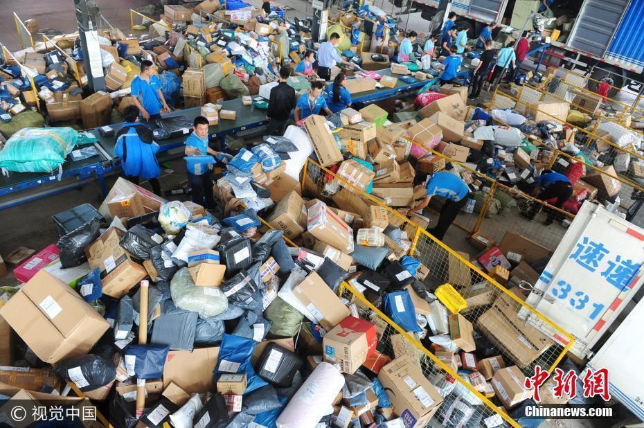10月9日,位于安徽省阜阳市颍东开发区的某快递公司内,快递工作人员在分拣中心忙碌着分拣“堆如小山”的快递包裹。当日,国庆、中秋“双节”过后,安徽省阜阳市快递业迎来小高峰,快递业务量持续增加,呈现快递满仓。各家快递公司积极组织快递工作人员在分拣中心忙碌着分拣“堆如小山”的快递包裹。同时,各家快递公司从人力、运力、场地等方面做好了充分准备,尽力保障小高峰期快件处理能力和速度。王彪 摄 图片来源:视觉中国