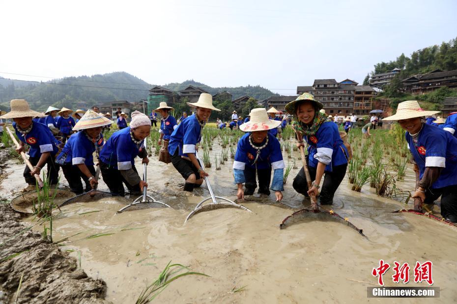 10月9日,广西柳州市三江侗族自治县妇联举行百名能手抓鱼收稻擂台赛,100余名侗族女子在该县林溪镇平岩村稻田内分组竞抓稻鱼、赛收稻谷,庆祝丰收。吴练勋 摄