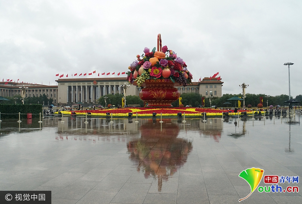 2017年10月9日,北京迎来降雨天气,天安门广场的各大建筑在雨中对称的倒影美景如画。