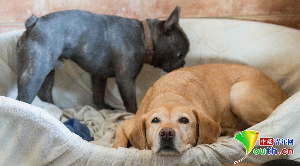 当地时间2017年10月13日,德国路德维希堡,狗狗旅馆的主人Pino Puglisi和寄宿的狗狗们在旅馆内。