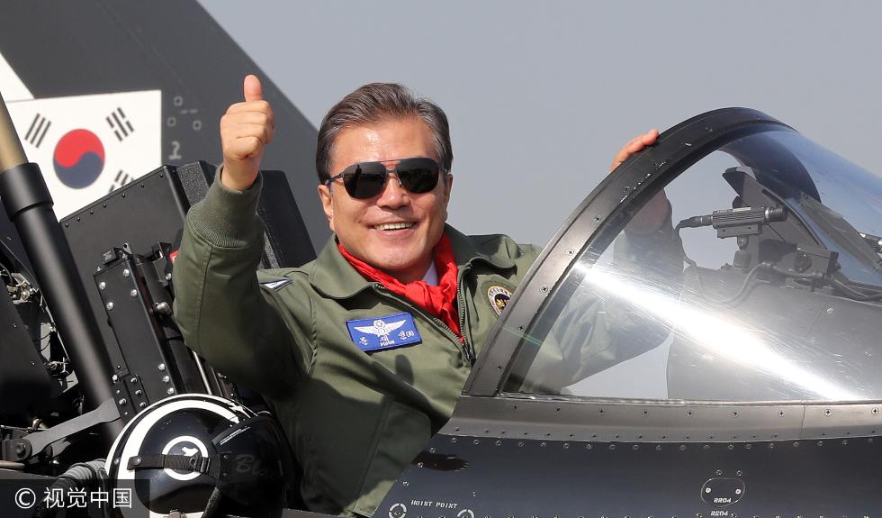 当地时间2017年10月17日,韩国首尔,“2017首尔国际航空航天暨军工业展览会”(ADEX)在京畿道城南市的首尔机场开幕,韩国总统文在寅出席并登上韩军“黑鹰”(Black Eagles)战机竖起拇指为战机点赞。