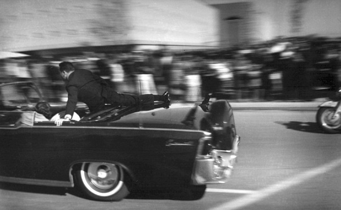 枪击后,保镖护卫在车后,送肯尼迪前往医院。