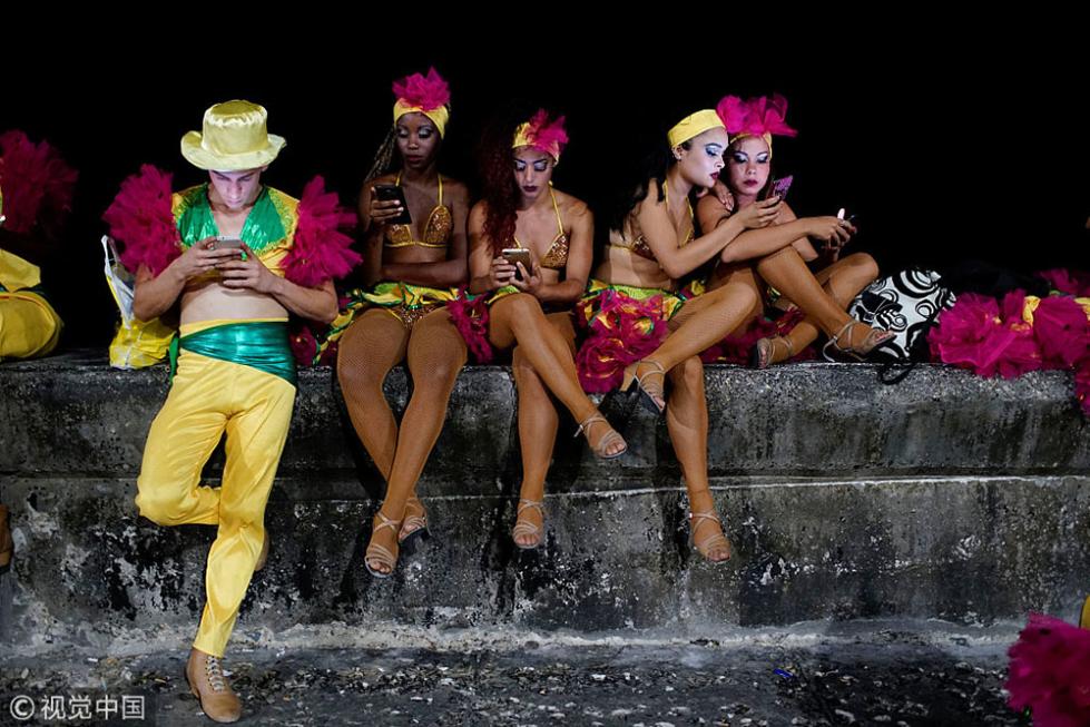 黄昏时分,当热潮消退时,古巴首都哈瓦那的公园里挤满了人,他们与远在国外的亲人聊天,或者在社交媒体上互动。一张张生动的脸被手机或平板电脑屏幕点亮。图为2017年8月18日,古巴哈瓦那,古巴狂欢节上,舞者们使用热点上网。供图:ALEXANDRE MENEGHINI/视觉中国