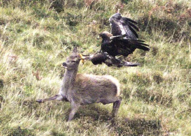 据英国《太阳报》11月7日报道,在苏格兰马尔岛,摄影师Dawid Banasiak抓拍这样一幕:一只金雕俯冲猛扑正在奔跑的一只小鹿,其爪子刚好抓住鹿头。对此,有人评论道:“一生中可能只有一次拍到这张照片。”