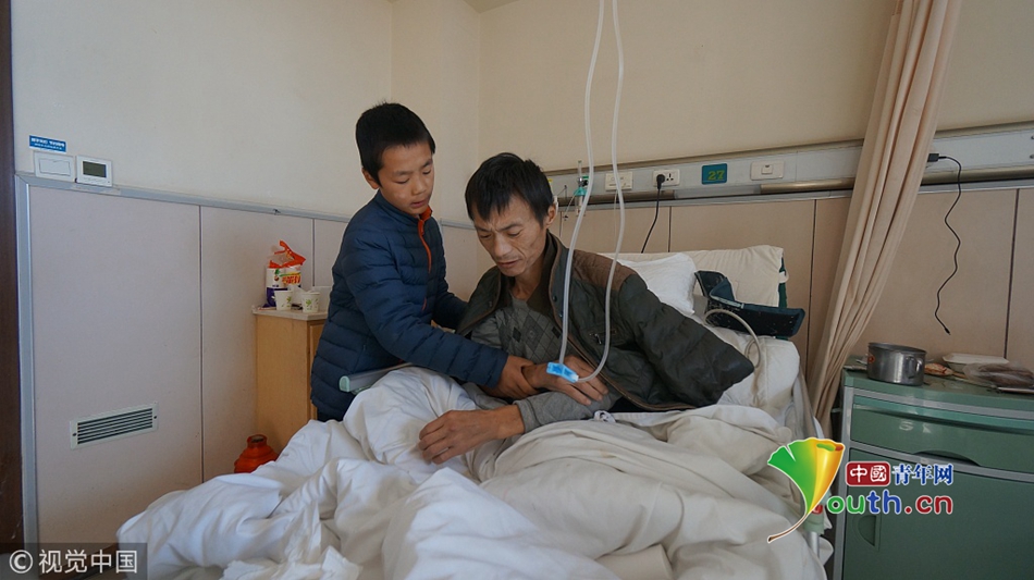 2017年11月14日,山东德州,“爸爸虽然经常喝酒抽烟很少照顾我,想到癌症晚期,舍不得他”,在山东禹城市人民医院,王志文(化名)今年12岁,3岁时父母离异独自跟父亲生活,家里可以说很贫困。子恒/视觉中国