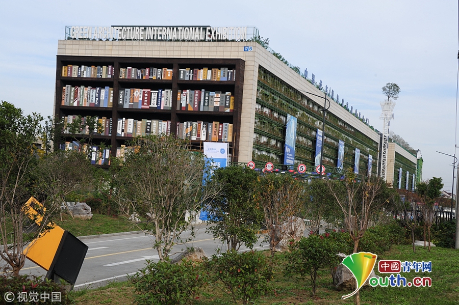 2017年11月25日,浙江省嘉兴市海宁市周王庙镇之江路旁一栋大楼最近成为“网红”引关注。大楼西侧的外墙,设计成了一个超大书架的形状,上面“摆放”着几可乱真的《巴黎圣母院》、《贝聿铭全集》、《高老头》、《天方夜谭》等近200册书籍,每本书高度2米左右。只是这些书并非是真正的“书”,而是按照“书”的形状设计而成的假“书”。据了解,这幢大楼名为绿建国际绿色建筑建材体验馆。系全国目前最大的绿色建筑建材一站式平台,专业聚焦于绿色建筑建材领域,是集品牌展示、工程信息发布、技术转让、业务洽谈等功能于一体的双主题绿色建材 外立面建材的建材体验馆。这栋高20米的大楼楼顶还建了一个高尔夫球场、足球场,种上了枇杷、桔子、香樟等树木,还建了一个长方形的水槽,里面养着供人观赏的锦鲤。大楼南侧外墙,则种植着9层,长度超过百米,超过上千棵的树木,整栋大楼看上去宛如一座“绿色森林”。