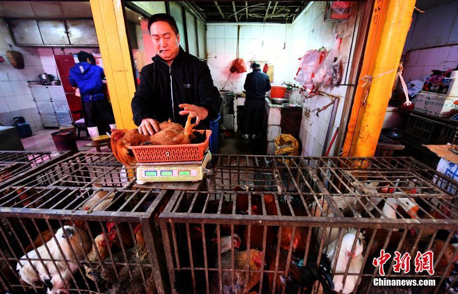 12月6日,商铺老板正在给鸡称重。当日,昆明篆新农贸市场里售卖禽类商家的生意没有受到影响。据云南省卫生计生委通报,11月30日,云南确诊1例H7N9病例。目前,患者在医院隔离治疗。所有与该患者密切接触者未出现异常,未发现人传人。疫情发生后,云南省卫生计生委和昆明市政府及时调集省市专家全力救治患者,开展疫情处置工作。中新社记者 李进红 摄