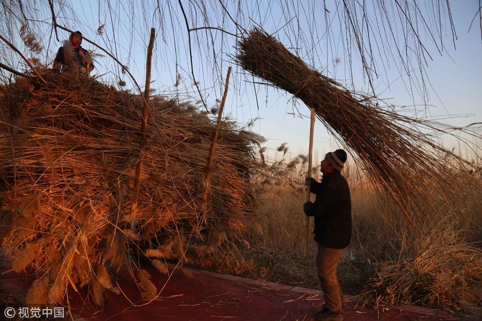 2017年12月19日,山东德州,早上7点天色刚明,65岁的祝保金开始下水割芦苇了。这里是德州的一湿地公园,每到冬季要清理水面的芦苇,一是防火再是如果芦苇腐烂到水里会造成河道淤积。