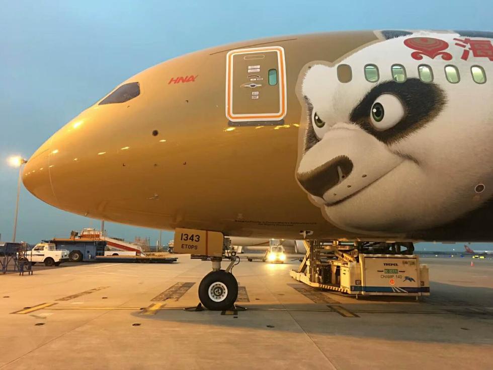 1月5日上午,网友@深圳蓝天001在深圳机场拍到海南航空最新一架功夫熊猫彩绘机,此时这架金色功夫熊猫彩绘机正准备执飞深圳-重庆。