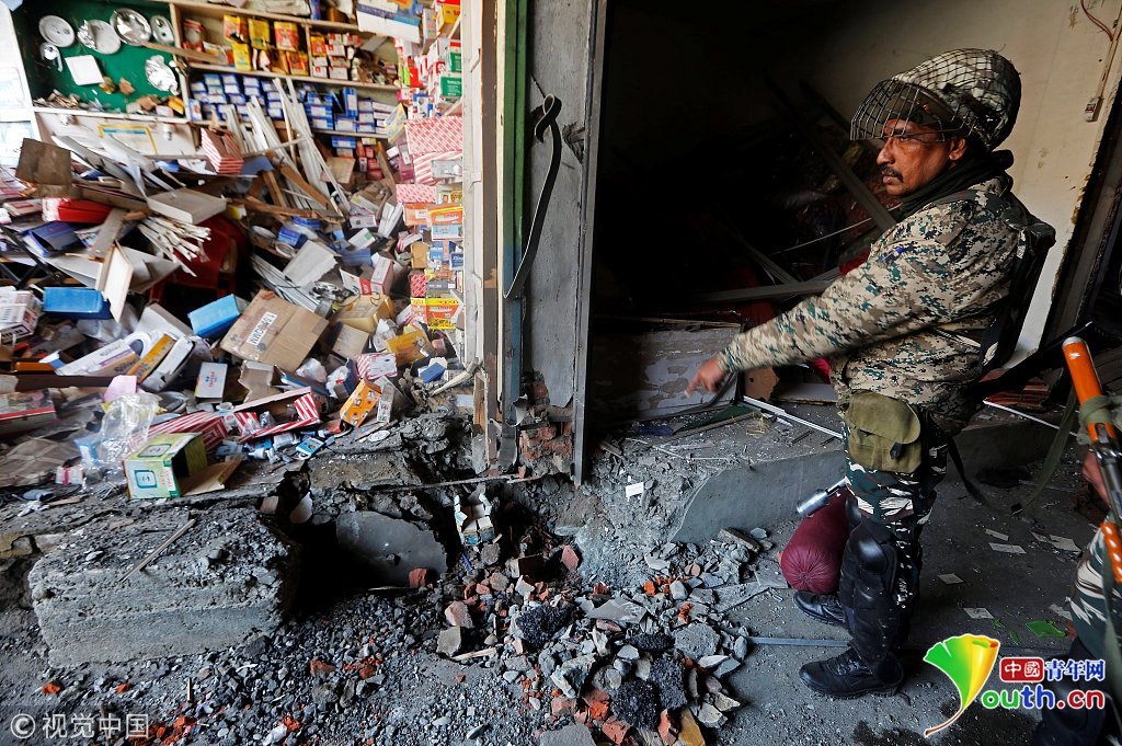 当地时间2018年1月6日,印度北克什米尔索普热,警察在街道巡逻。据当地媒体报道,疑似武装分子在一个市场引爆了简易爆炸装置,导致4名警察丧生。图片作者:DANISH ISMAIL