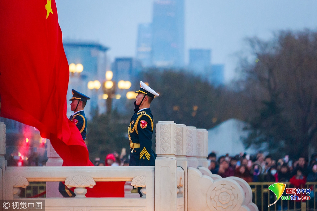 2018年1月7日,北京,中国人民解放军三军仪仗队在天安门广场举行降旗仪式,吸引大量游客和市民观看。自2018年元旦始,武警国旗护卫队完成使命,将成为历史。以后的国旗护卫队将隶属于中国人民解放军三军仪仗队。图片作者:詹敏