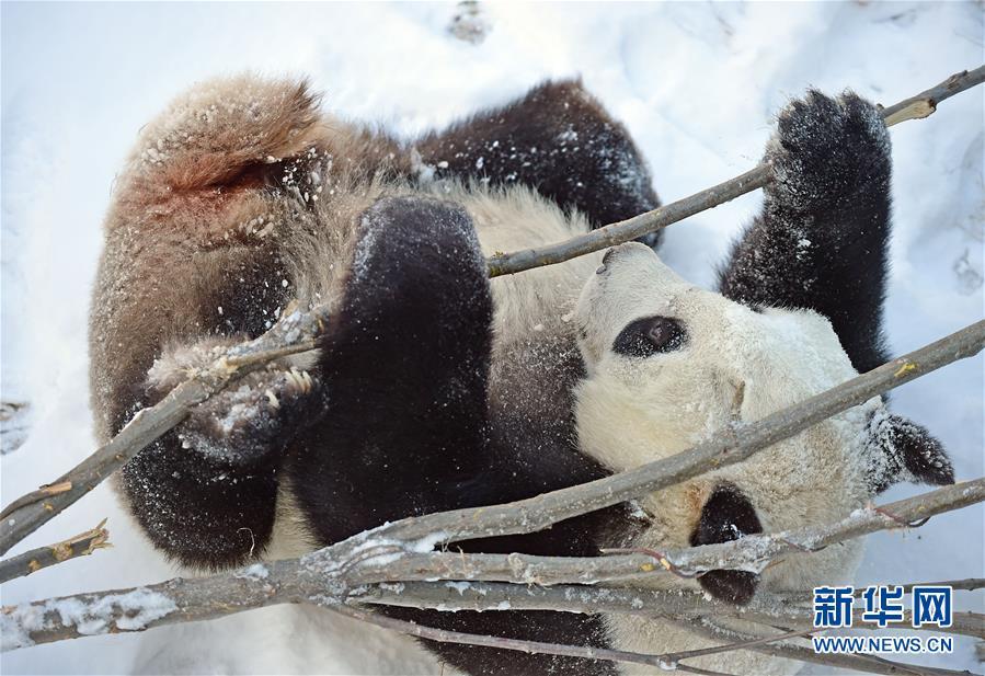 1月9日,沈阳森林动物园的大熊猫在雪中嬉戏玩耍,享受雪趣。新华社记者 杨青 摄