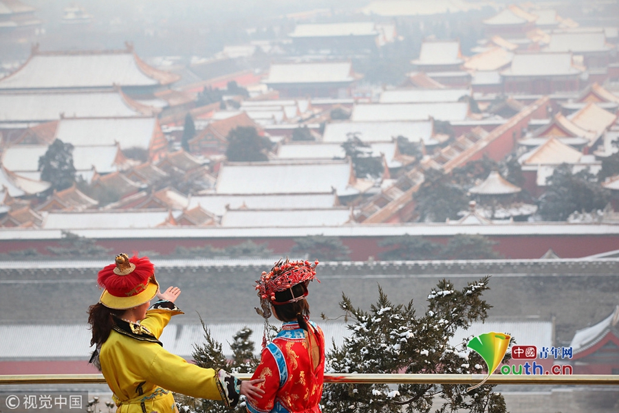 2011年2月13日,两名身着清代服饰的游客俯瞰被积雪覆盖的北京故宫。当日,北京飘落兔年第二场雪,部分地区积雪达15厘米。