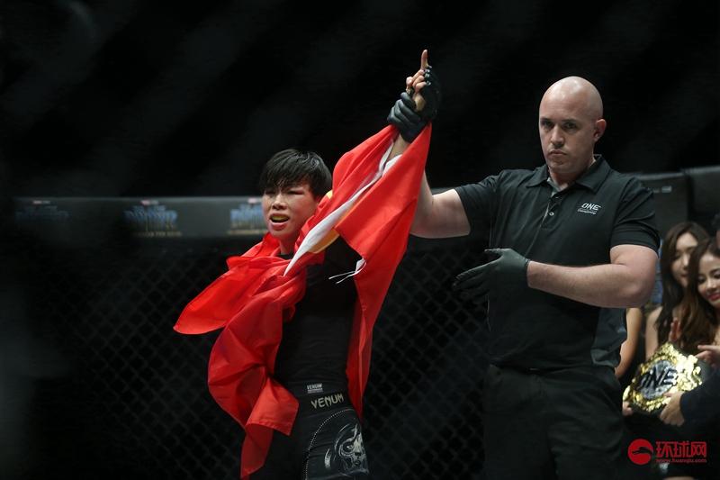 2018年1月20日,印尼雅加达。在ONE冠军赛2018首场开年大赛的头条主赛中,中国女子综合格斗选手熊竞楠在第四回合成功TKO新加坡选手张汇雯(Tiffany Teo)登顶草量级冠军,成为第一个拿下ONE冠军金腰带的中国人。(摄影:崔萌)