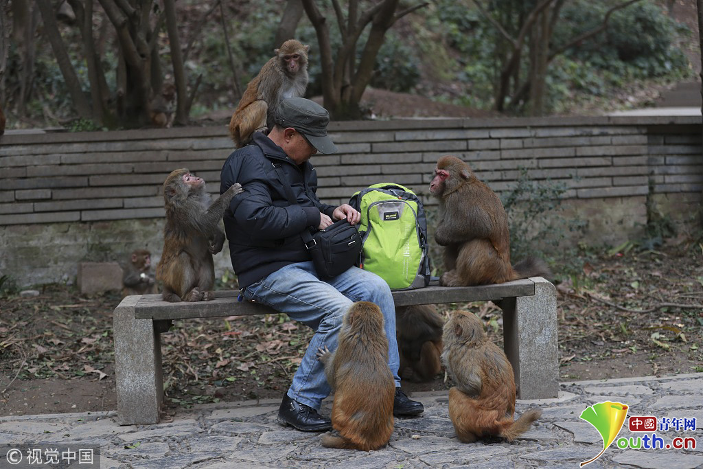 2018年1月26日,贵阳,一群猴子等待游客喂食。