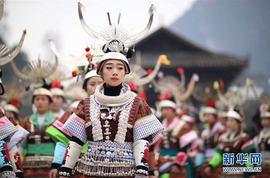 2月3日,在贵州省黔东南苗族侗族自治州丹寨县兴仁镇岩英村,盛装打扮的苗族女孩在跳芦笙舞。当日,贵州省黔东南苗族侗族自治州丹寨县兴仁镇岩英苗寨举行芦笙会,喜迎春天的到来。 新华社发(黄晓海 摄)