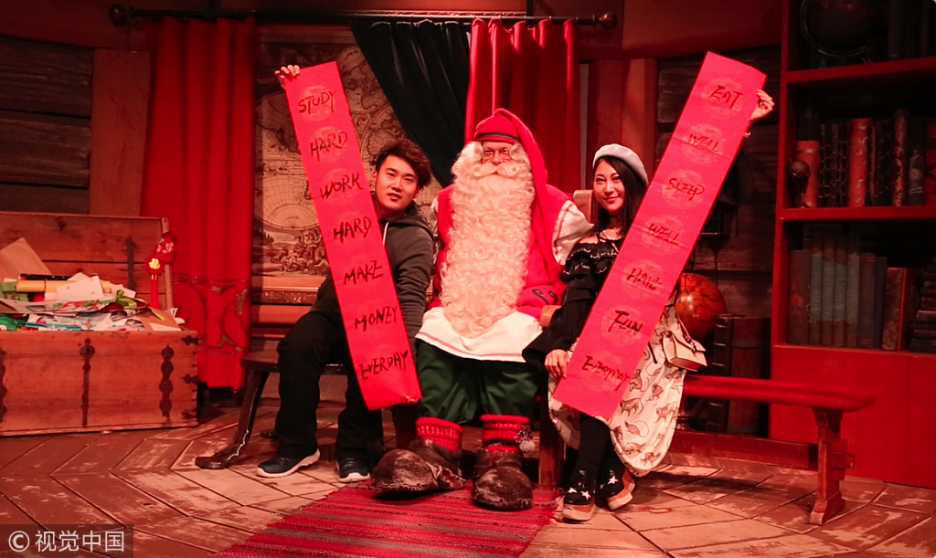 更有趣的是,从神话中走出的圣诞老人,也迷上了中国。这段时间来罗瓦涅米的中国游客,会惊喜的收到来自圣诞老人的特殊礼物,写有“LUCKY”(福气)、“SUPER WINNER”(人生赢家)等颇具喜感的英文对联和福字,这是圣诞老人的小助手小精灵们特意为中国游客准备的惊喜。“团聚、喜悦与分享,是新春佳节和圣诞节最重要的元素。”圣诞老人表示,早早就知道了中国春节,每逢中国游客进入他的办公室,他就一定会用中文问候“狗年吉祥”。