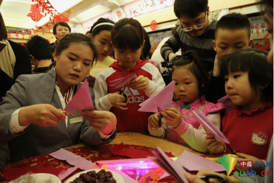 在北京西开往西安的T41次列车上,列车工作人员带领小旅客一起学习陕北剪窗花技艺。张雁南张鑫供图
