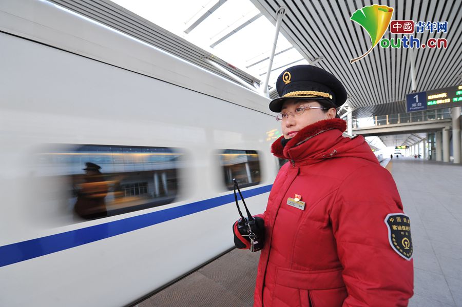 客运值班员张娜立岗接车。中国青年网通讯员 王戈 摄