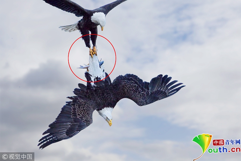 中国青年网北京4月12日电 美国马里兰州科纳温戈大坝,两只美国秃鹰在空中争斗。其中一只正向地面俯冲,另一只紧抓它的尾巴穷追不舍,试图抢夺它刚捕获的鱼。 (具体拍摄时间不详),图片作者:Solent News/视觉中国