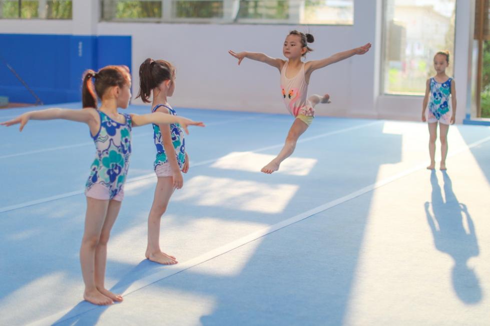 小学员徐子涵(右二)在榕江县少年儿童业余体操运动学校内进行体操训练(5月15日摄)。新华社记者刘续摄