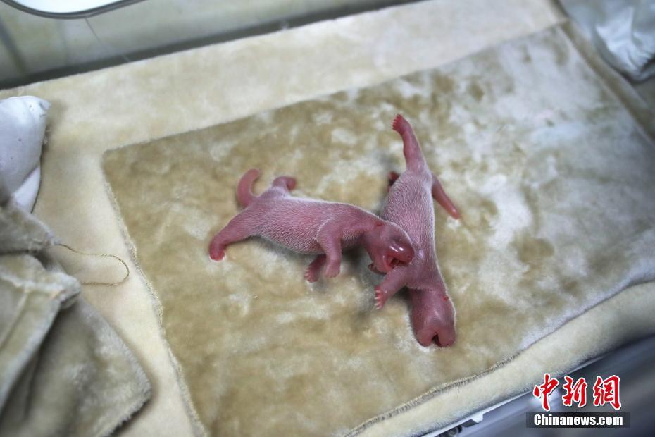 7月2日,成都大熊猫繁育研究基地大熊猫“庆贺”产下龙凤胎。大熊猫“庆贺”于2日早上7时23分破羊水,于7时53分产下大仔,8时15分产下小仔,此次生产为大熊猫“庆贺”第三次产仔,经验丰富的“庆贺”表现出极强的母性,大仔初生体重117.2克,雌性,小仔初生体重140.8克,雄性,母子平安。崔凯 摄