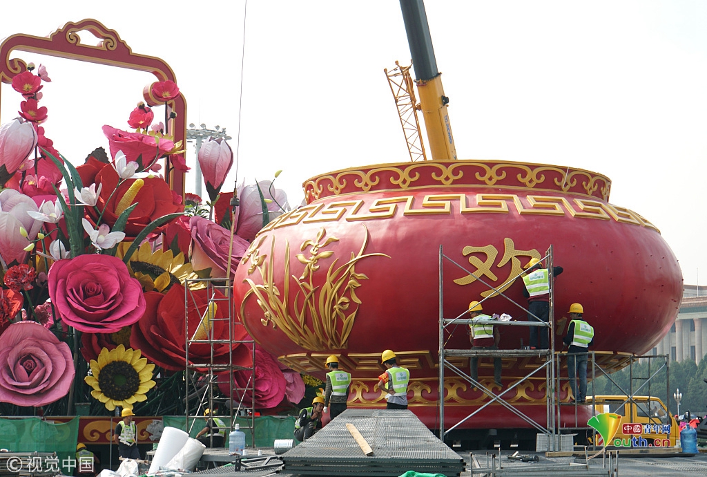 2018年9月20日,北京天安门广场,“祝福祖国”中心花坛正在加紧组装,巨大的花篮已初露"芳容",主体即将亮相。